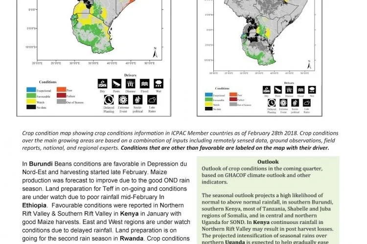 The University of Maryland is working together with ICPAC to implement an IGAD region crop monitor that would allow the development of an agricultural consensus report (ICPAC Crop Monitor Report) that can be linked and reported alongside the climate outlook forum. The proposed report will summarize the current status of major agricultural crops in countries at risk for food insecurity. The report offers an evaluation of the crop and by extension climatic season. The information in the report will originate from national and international agencies using field information including remote sensing and will be synthesized through consensus building.