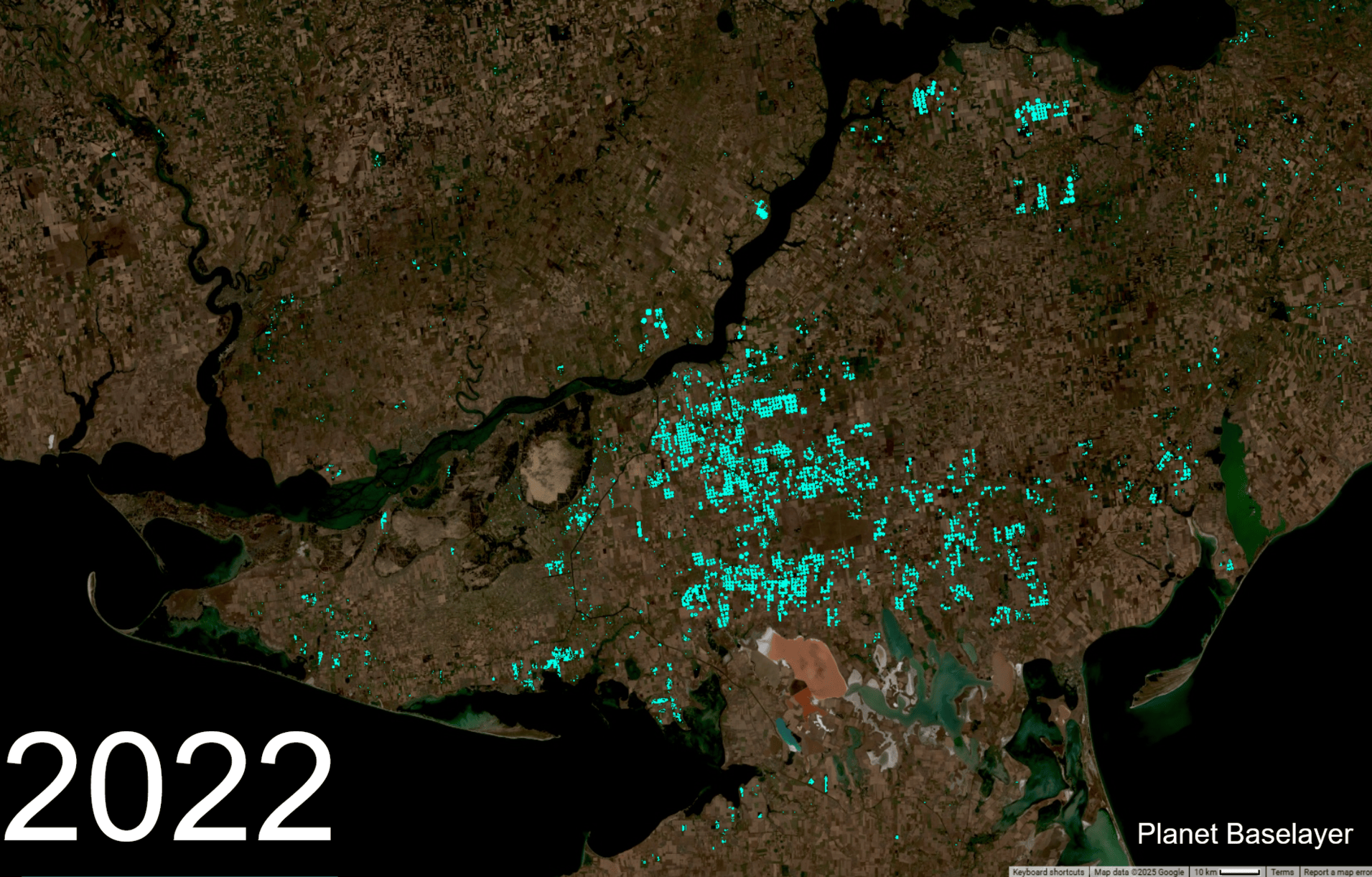 “The loss of the Kakhovka Reservoir produced rapid changes in the landscape. Within weeks of its loss in June 2023, once-irrigated fields were heating up and drying out. Some fields continued to stay green–but it did not necessarily mean that these fields were being irrigated. 2024 showed a dramatically different landscape where vast swaths of Kakhovka and Zaporizhzhia were left bare and dry–a pattern that continued into 2025. A few fields managed to still implement irrigation (a testament to Ukrainian farmer resilience), but at a scale that is not comparable to what existed before.”